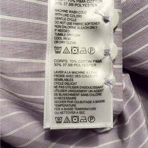 Shirt is purple with white stripes (stock photo shows is same style but different color)