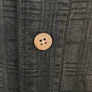 Tommy Bahama Silk Shirt. Men's Tag Size Medium (loose fit). 100% Silk. Soft brushed silk. Dark grey on grey plaid pattern. Wooden buttons. Two flap close chest pockets. Single button adjustable cuff with button up wrist tab.