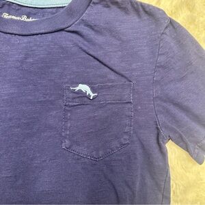 Navy blue tee with a chest pocket. Features embroidered Tommy Bahama logo.