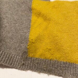 This poncho still has the tags attached but they are cut. There is one side that has been damaged, there is extensive fraying on the yellow portion of the poncho.There is a small stain on the beige part of it. Please see all photos for exact item.