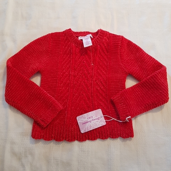 Tommy Bahama girls size 5/6 red plush long sleeved pullover sweater, scalloped bottom cuff, feels like velour