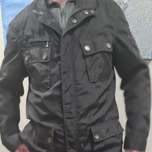 logo on the sleeve, logo on the sleeve large buttons with engraved logo as well, multiple pockets ,zip closure and snap buttons, beautiful!