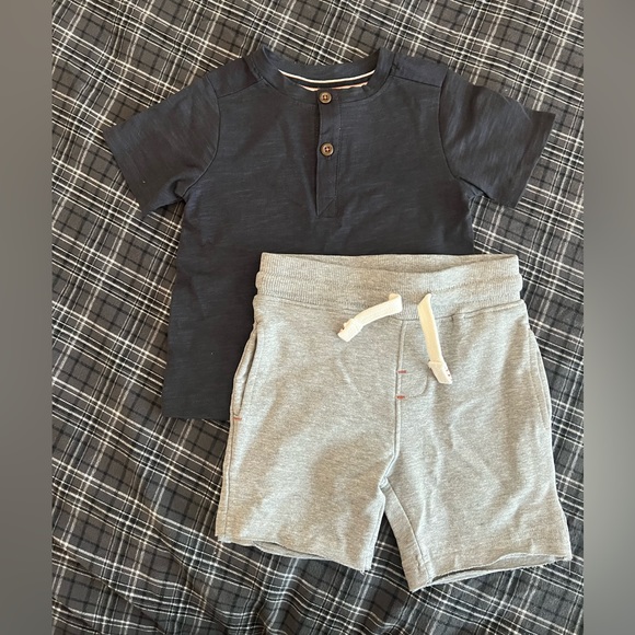 Heather navy tee with buttons, matching grey drawstring shorts. 100% cotton.
