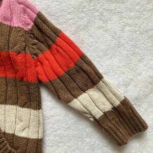 Tommy Hilfiger baby sweater in a hooded style, size 6-9 months. 100% cotton. Multicolour striped pattern in brown, red, pink, and cream knit. Half-button front for easy dressing, ribbed cuffs and hem, and kangaroo-style pocket.
