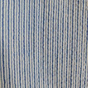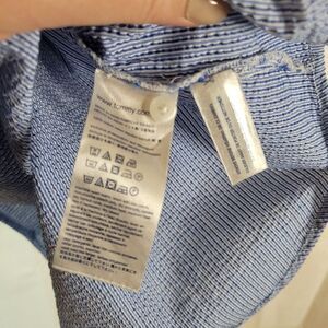 Gorgeous cool touch natural stiffened cotton fabric blue and white round neck blouse with 3/4 length 2 tier flare sleeves and a cute button down detail at nape of neck. EUC Like new