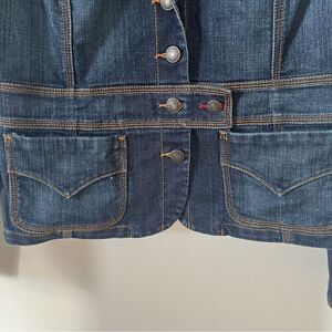 Stylish blue jean jacket. Features button closure. Multiple front pockets. Classic design.