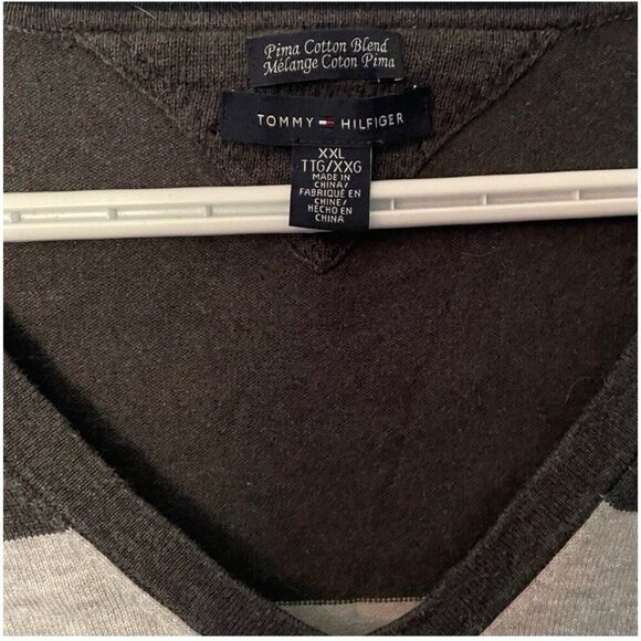Wrap yourself in the timeless elegance of the Tommy Hilfiger Blue Stripe V-Neck Sweater, tailored for a comfortable plus-size fit in a generous XXL. Crafted from soft, breathable cotton, this pullover is a versatile addition to any wardrobe, effortlessly transitioning from business to casual wear and ideal for travel. Its classic striped pattern and V-neck design exude a sense of understated sophistication, while the long sleeves make it suitable for cooler seasons like fall, spring, and winter.
