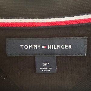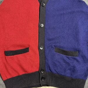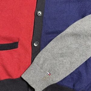 Features blue, red, and grey color blocking with button detail, triple layered cardigan effect, raised collar detail, and embroidered Tommy Hilfiger patch on sleeve.