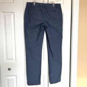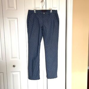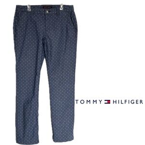 Classic with a twist! Tommy Hilfiger straight leg casual pants in classic Tommy style, chambray blue background with bright blue polka dots. Featuring slash pockets on front, welt pockets on back, zip fly, topstitching. 98%Cotton 2Elastane. Made in India. Size 6. Approx flat measurements : Waist 16” Hip20” Rise8.5” Inseam30” LegOpening6.75”. In last photo I noticed one stitch in the topstitching is missing, however the seam is intact, there is no hole.