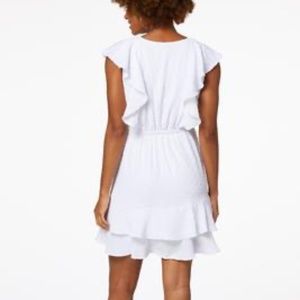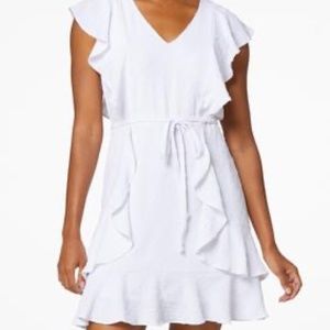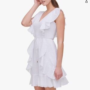 Self tie at the waist; ruffled at front, back bodice and hem; allover flair-dot stripe fabric
