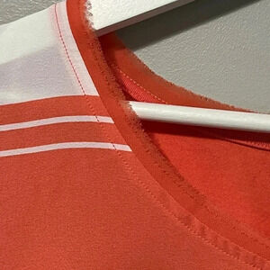 Like new condition. Super soft lightweight tee. Frayed edges in collar and hem. Striped on front only. Coral & white.