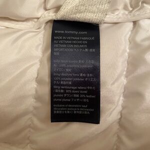 Tommy Hilfiger Down Filled Micro Puffer. 80% down fill to keep you cozy in the winter time! Removable hood for versatility. Embroidered monotone Tommy Hilfiger crest on the left arm and flag on the neck, with classic striped cuffs.