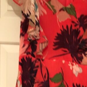 lined, has ruffles, worn once, zipper on the back, pit to pit 18 inches, waist- 16 inches, length - 37.5 (top to bottom), length from eh V neck is 29 inches, polyester, has small loops but did not come with the belt