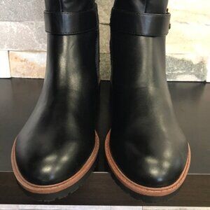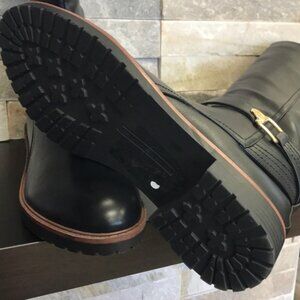 Gold-tone logo branding intensifies the chic appeal of this sleek knee high boot that features a lug sole to stay fashionable in any type of weather.