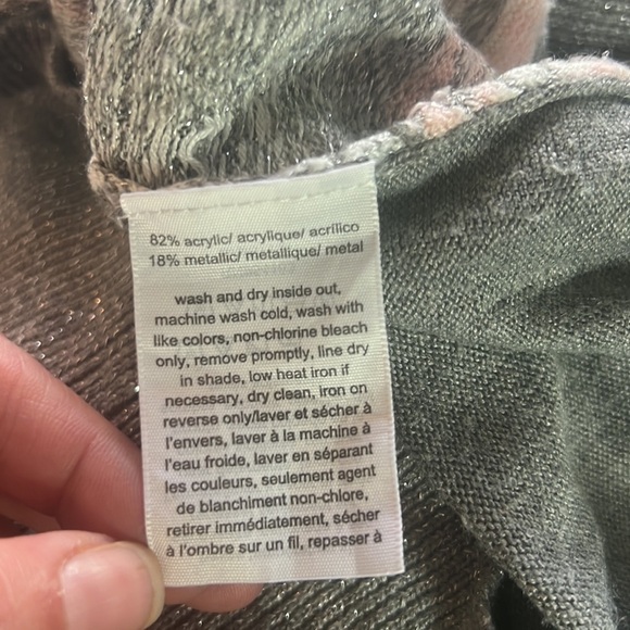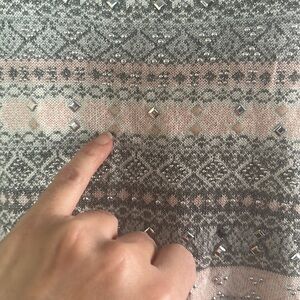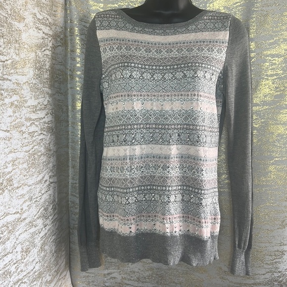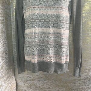 - This beautiful sweater is perfect for the winter holidays! Featuring a grey, pink and white snowflake-like pattern with silver metal appliques and metallic silver threading throughout, it is cozy and festive!