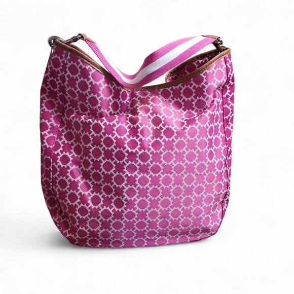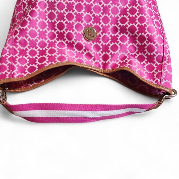 Color: Hot pink with brown faux leather trim Shoulder strap: Pink and white canvas with signature Tommy vibes. Measures 14" x 10" x 4.5"