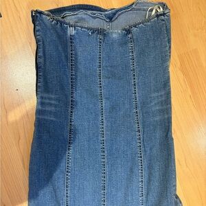 Stylish maxi strapless dress in denim style. Tommy Hilfiger. Size medium. The dress is very long, I think it would fit better as a taller person ( i’m 5"3 and it does reach the floor and i step on it). Don’t hesitate for measurements. Some stains on it (main one the bottom right of the dress (see 8th and 9th picture)) (a smaller one shown on the first picture)