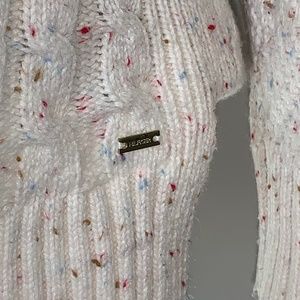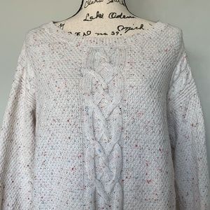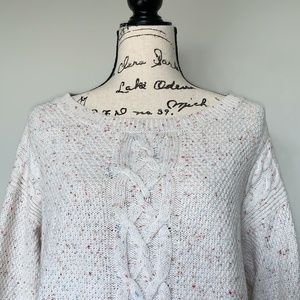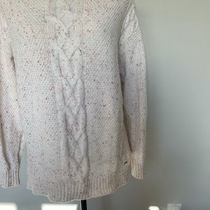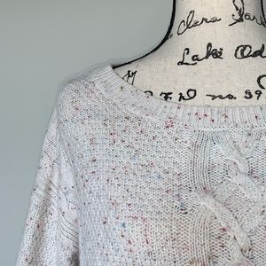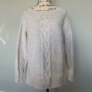 A cream-coloured sweater with a subtle yet colourful melange. It is not too long, the fabric is stretchy, and the cut is relaxed. It is NOT WOOL, so it is not scratchy.