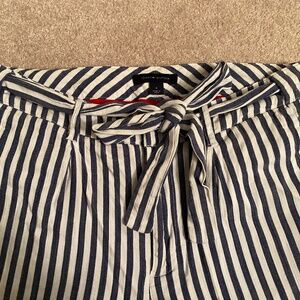 Tommy Hilfiger Lightweight Tie-belt Pants. Ankle length, mid-rise, perfect for summer with navy and white vertical stripes. Zipper fly with button. Pockets on the front, false pockets on the back. Cotton and viscose blend.
