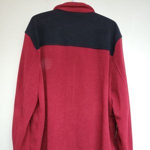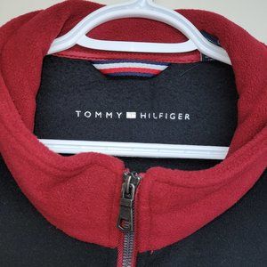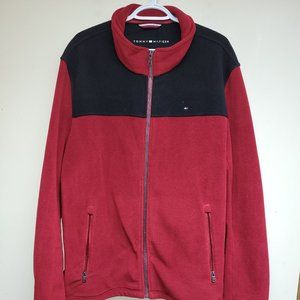 Maroon and black Tommy Hilfiger Men's 2XL fleece zipper front sweater. 100% polyester, very clean and looking sharp. This is what the Starfleet uniforms might look like if Hilfiger designed them, don't you think? It has this cool Jean Luc thing going on...I always thought so anyway.