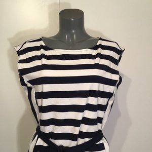 You will be ready for boating season in the midi dress with bold navy and white stripes (horizontal front and back, vertical on the sides), cap sleeves and square neckline. Finish off the look with a fabric tie belt.