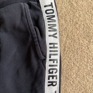 Tommy Hilfiger Navy Ankle Length Sweatpants. Like new condition. US women’s size medium. Mid to low rise fit. Embroidered Tommy Hilfiger flag logo on the hip, graphic “Tommy Hilfiger” striped down each leg. Drawstring waistband with two front pockets. 80% cotton, 20% polyester.