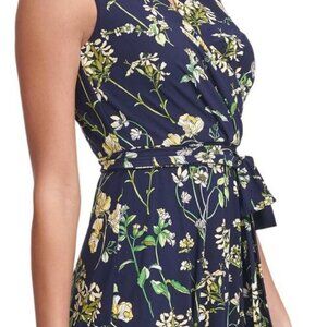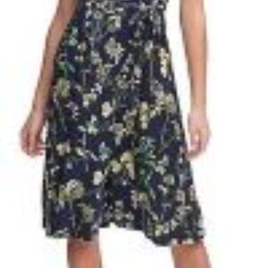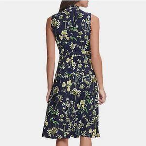Elegant navy dress with floral print. Sleeveless design. Perfect for any occasion.
