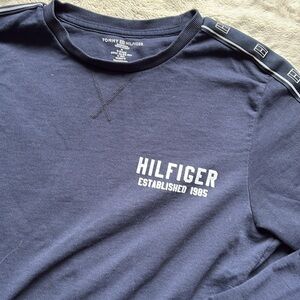 Stay classic and comfortable in this Tommy Hilfiger long sleeve logo top. Crafted from a soft 60% cotton blend, this navy crewneck features bold “Hilfiger Established 1985” text on the chest and branded logo tape along both sleeves for a sporty, elevated touch. Perfect for casual wear, lounging, or layering year-round.