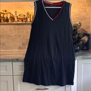 Navy sleeveless dress by Tommy Hilfiger. Features V-neck with red and white trim. Pit to pit is 20”. Excellent used condition