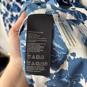 This sleeveless dress by Tommy Hilfiger showcases a white background adorned with a bold navy floral print. Features a flattering V-neck wrap-style bodice and fit & flare silhouette. Great quality and perfect for weddings, work or formal occasions. Measurements: PTP 22" | Length: 40". Condition: 9/10.
