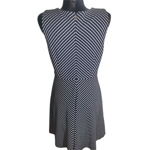 Stylish navy and white striped sleeveless dress. Diagonal striped pattern with rope loops for a belt (I took the pictures with a rope style belt, but does not come with a belt) Has a back zippered closure.