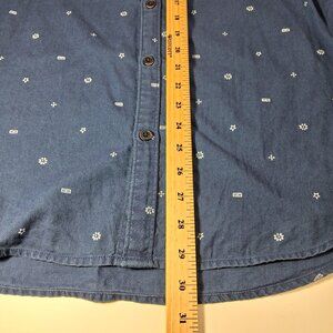 Tommy Hilfiger long-sleeved button-down shirt. Blue denim-like fabric with white patterns. Collar, button-front closure, chest pocket, and buttoned cuffs.