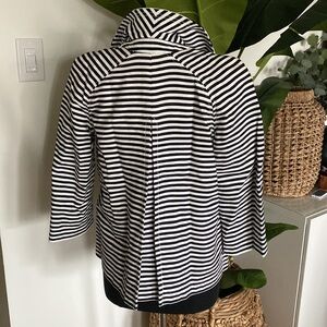 New with tags, Tommy Hilfiger, women's size small, classic nautical style, blue & white striped jacket/coat, fully lined, side slant pockets, gold tone front button closures, 3/4 sleeves, cotton spandex blend, machine washable. care label attached.