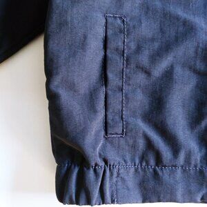 Lightweight midnight blue jacket by Tommy Hilfiger with mesh lining, a pack-away hood, and made from 100% nylon. The Hilfiger logo is printed on the back of the collar, and there are two front pockets. Additionally, a logo patch is displayed on the sleeve. The jacket is in excellent condition.