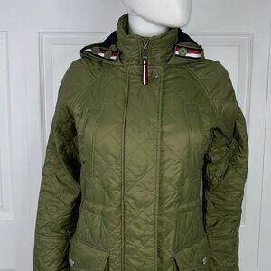 Stylish olive quilted jacket by Tommy Hilfiger. Features a hood and front pockets. Perfect for cool weather.