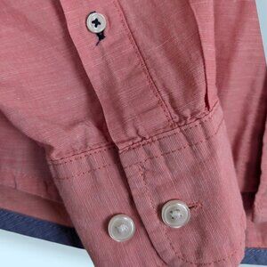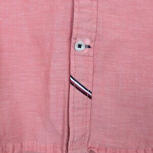 This shirt by Tommy Hilfiger is made of a cotton/linen blend (90/10) and is pink with white pearlescent buttons. The shirt has long sleeves with button cuffs, a collar with button corners, a button front, and a pocket on the left chest. When I first got this shirt there were some black marks on the back towards the bottom. I've given the shirt a couple deep oxyclean soaks and I believe the marks have faded to the point where they're barely longer visible. Still, I think it's worth mentioning because I can still tell they're there, but I'm not sure if that's because I already know they're there. Picture 2 shows a far view, and picture 5 shows a close up. As far as colour, picture 6 shows that the shirt looks like a coral tone in certain light, but the pink colour is a more accurate representation.