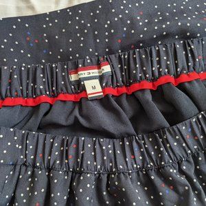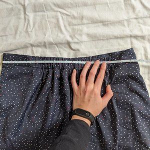 The colour is a very dark navy with white polka dots as shown in picture. Pockets on either side with an elastic waistband!