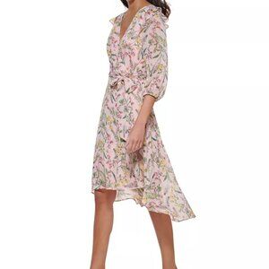 A faux wrap silhouette cuts a flattering figure in Tommy Hilfiger's gorgeous dress, a sweet floral printed piece framed by dramatic 3/4-length balloon sleeves.