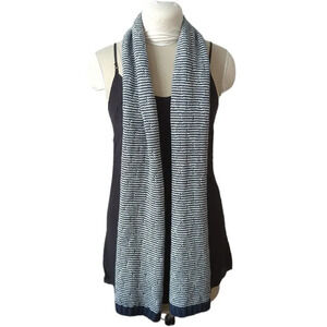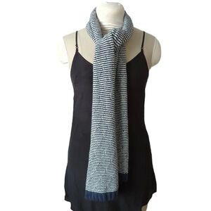 This is a reversible knit scarf by Tommy Hilfiger. Textured blue and white stripe pattern on one side and crisscross pattern on the other.
