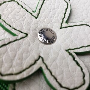 White leather flower cutout with silver coloured stamped hardware in the center.