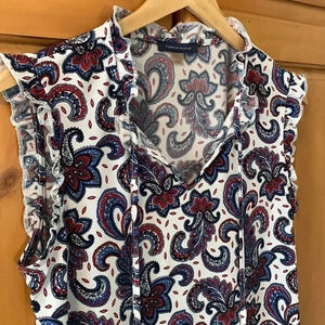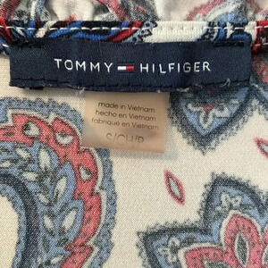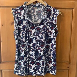 Navy and red Paisely pattern on white stretch fabric. Size Small. Like new condition.