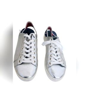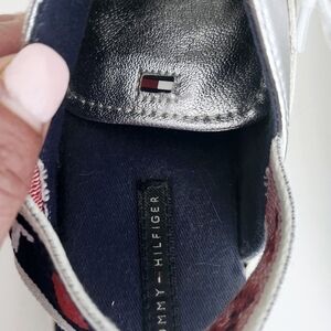 Step into style with these Tommy Hilfiger silver sneakers, size US 6.5. Featuring a unique back sling design for a secure and modern fit, these shoes combine fashion and comfort. Perfect for casual days, walks, or adding a sporty touch to your outfit. Lightly worn and in great condition.