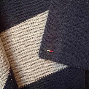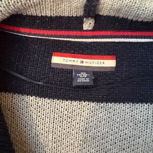 Tommy Hilfiger Striped Cascading Cardigan w/ Shawl Collar. Thick cotton/acrylic/elastane blend to keep you cozy in the winter. Alternating grey and navy striped knit keeps it chic and classic.