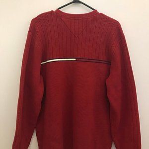 Red, knit sweater with iconic Tommy Hilfiger Logo. It is originally a men's sweater but can be styled oversized for women as seen in photo.