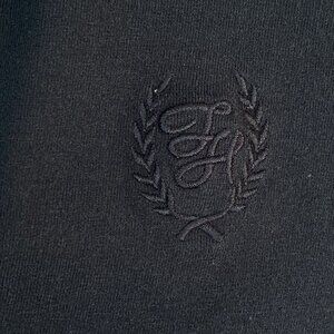 V neck with collar. Half sleeve. Ribbed cuff and hem. Stretchy. Embroidered chest logo.