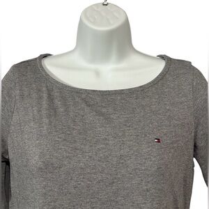 This grey Tommy Hilfiger T-shirt dress is a versatile and comfortable addition to any wardrobe. Made with a soft, stretchy fabric blend (60% cotton, 40% modal), it's perfect for everyday wear. It features three-quarter sleeves and a classic boat neck.