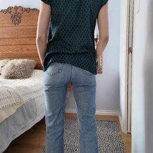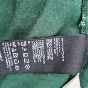 Forest green top with navy polka dots. Subtle ruffles in the bust area; cap sleeves. 100% cotton from Tommy Hilfiger.