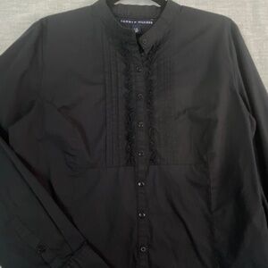 Tommy Hilfiger Top. Women's Tag Size Large. Cotton / spandex blend. Black. Long sleeves with 3 button cuffs. Button up front. Mandarin Colalr. Pleated and ruffled yoke. Curved hem.