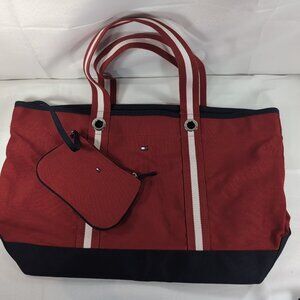 Tommy Hilfiger Tote Bag Matching Pouch Set Red Navy Blue Stripe Straps Large