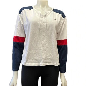 Vintage ladies Tommy Hilfiger white, blue and red, crop, long Sleeve top, crew neck with drawstring.